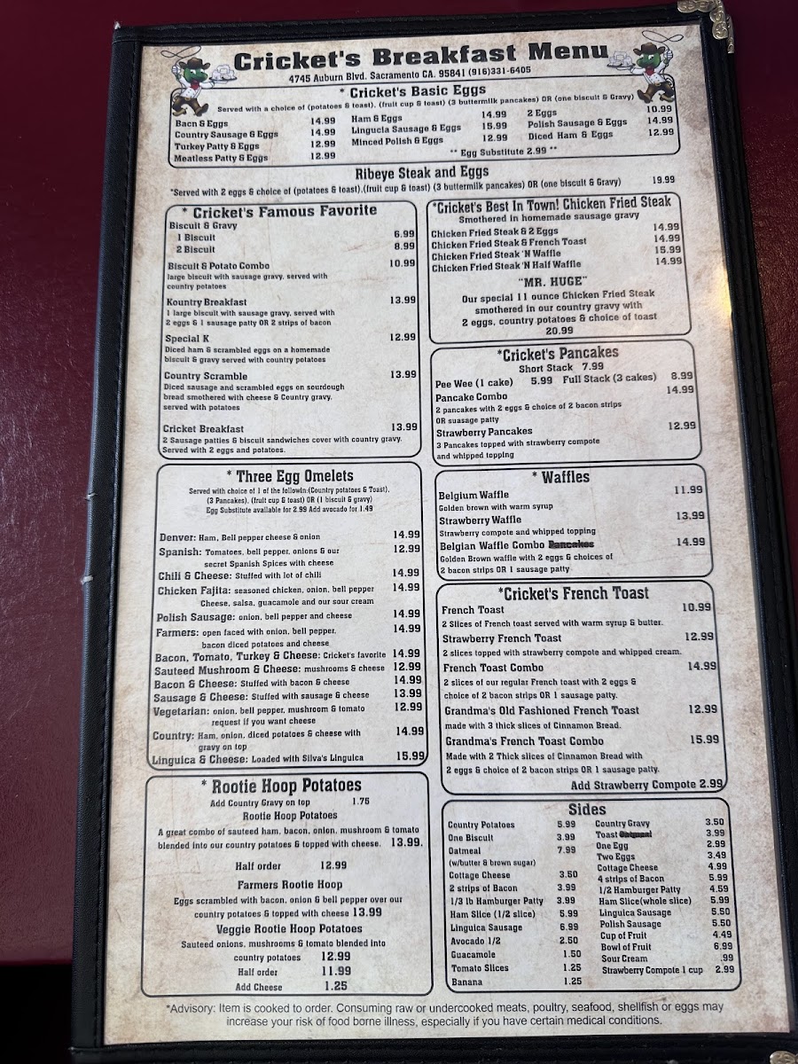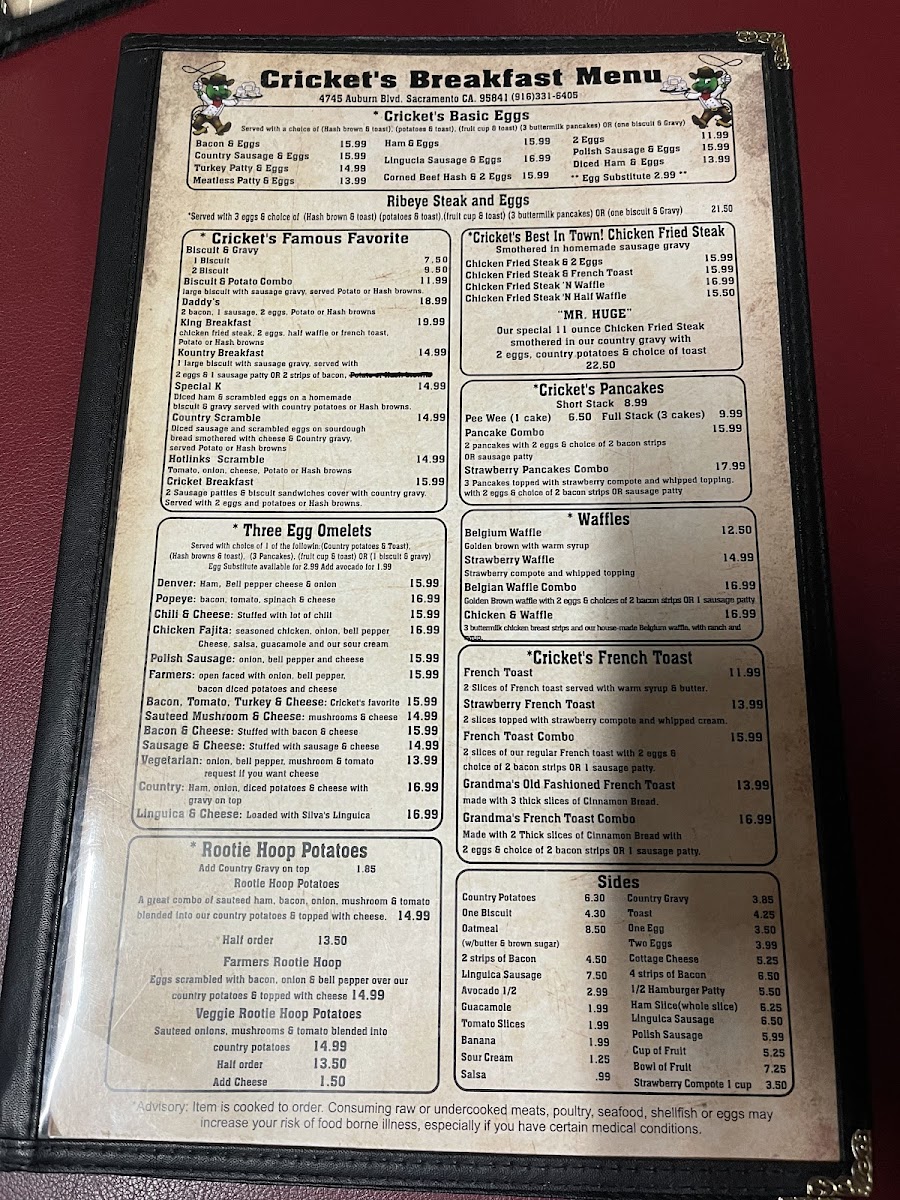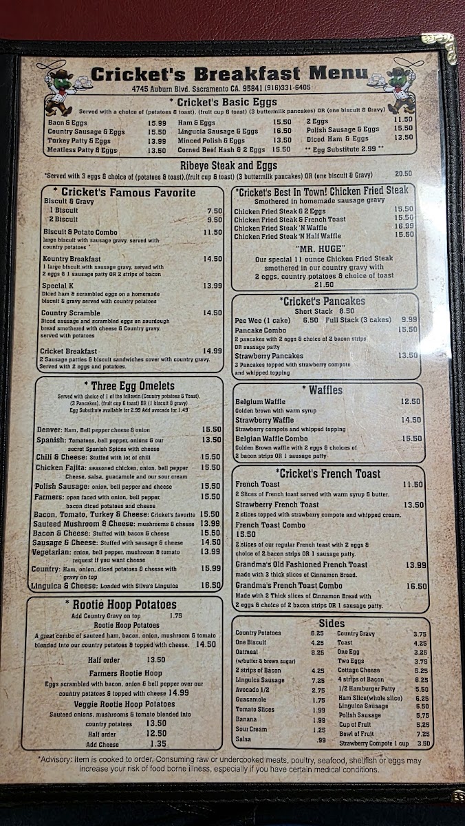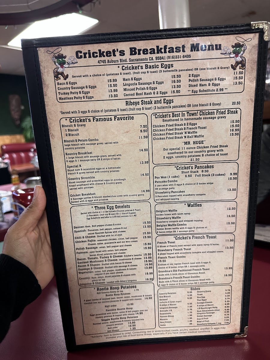 Welcome to Cricket Country Kitchen, a delightful gem tucked away at 4745 Auburn Blvd, Sacramento, CA 95841. This charming restaurant embodies the spirit of a traditional American diner, offering a cozy and nostalgic ambiance that transports you to simpler times. With its rustic decor featuring vintage ranch tools, antique memorabilia, and even a replica Union Pacific train, you can enjoy a meal surrounded by history and charm that echoes a homely, down-to-earth vibe.